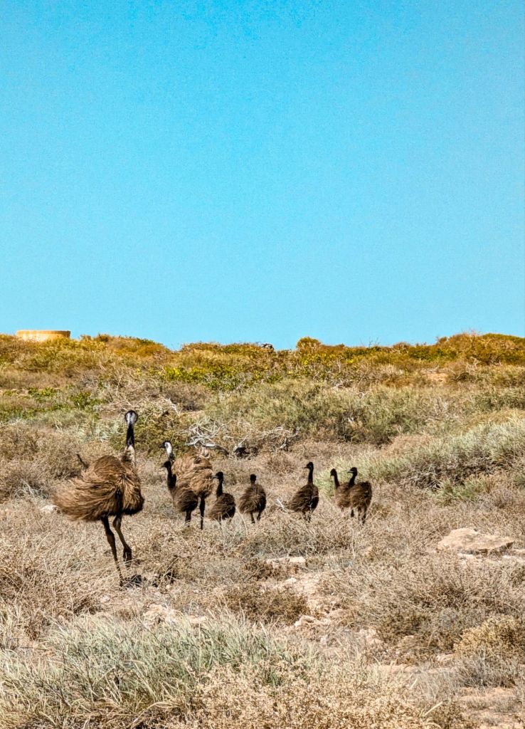 Obwohl wir wirklich viel Zeit haben, müssen wir trotzdem langsam richtig Süden ziehen. Wir sind so richtig im Reiseleben angekommen und brauchen irgendwie auch für Streckenbschnitte von 2 Stunden den ganzen Tag weil wir immer mal wieder anhalten für einen Spaziergang, Aussichtspunkt, Bäckereien oder für ein Zmittag inklusive Pfüsi am Strand. Nach einem schönen Abstecher bei den Quobba Blow Wholes sind wir am Strand entlang weiter Richtung Norden gefahren und haben unterwegs eine Emu-Familie mit 5 Jungen gesehen. Übernachtet haben wir auf Quobba Station, einer riesigen Schaffarm. Das war ein echt schönes Erlebniss. Leider hat ab hier ein heftiger Wind begonnen zu wehen.
