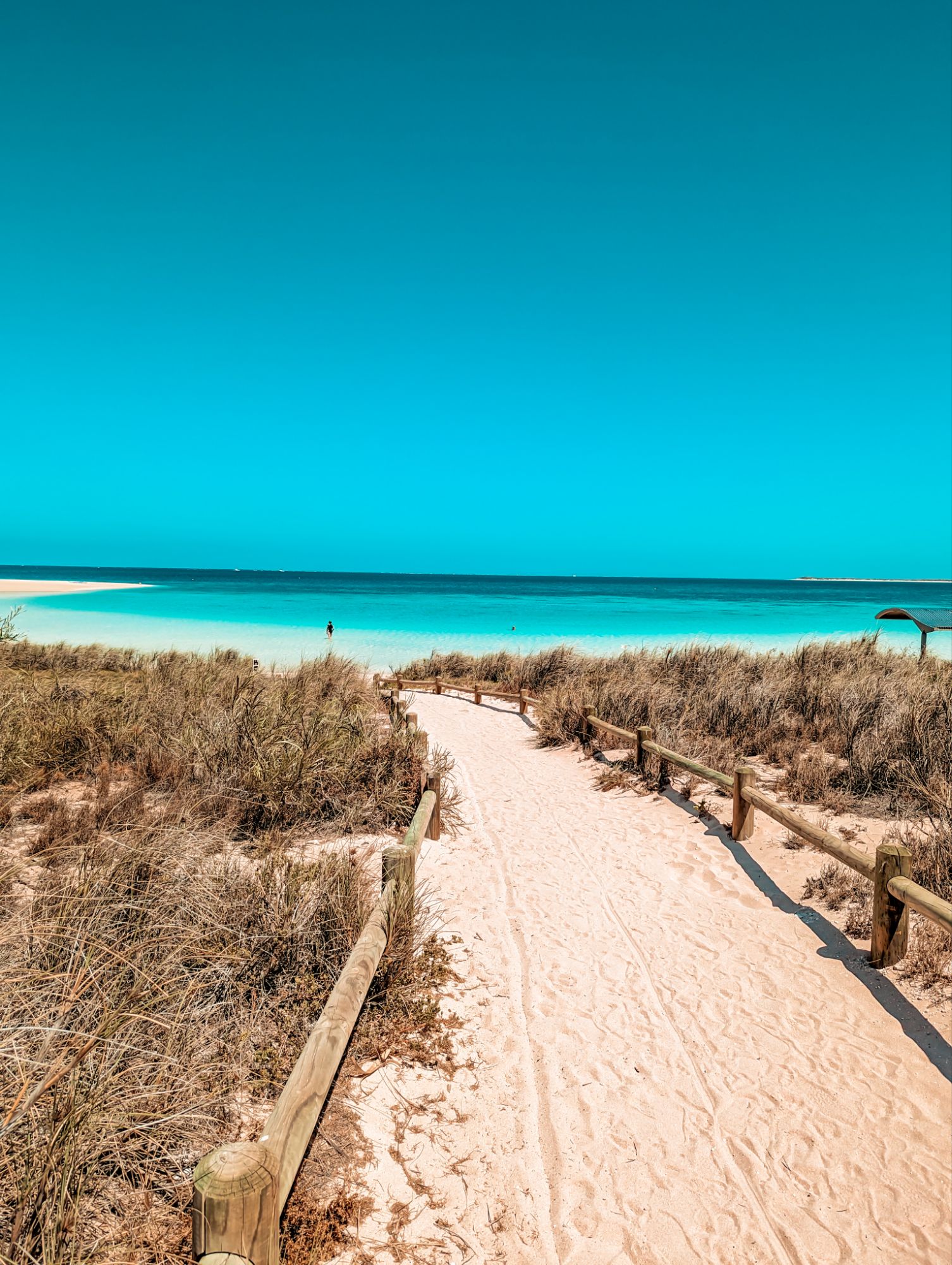 Im Welt Kulturerbe von Shark Bay haben wir auch wieder ein paar Tage verbracht. Hier war der Wind dann echt heftig. An ein campen an direkter Strandlage war hier nicht mehr zu denken. An dieser Stelle mal ein fettes MERCI an meinen super Reisebuddy und Teilzeit Mechaniker, die dieses Zelt alleine auf das Auto gemurkst hat. Und all die Neider die meinten, dass das Zelt doch eh nicht hält. Es hält sogar bei Windböhen um die 60kmh. Direkt am Meer. Während 12 Stunden. Und wir haben sogar gut geschlafen trotz des riesen Lärms. Zur Shark Bay zählt natürlich der bekannte Eagle Bluff Lookout, der direkte Sicht auf das seichte Meer bietet und praktisch immer sind Haifische im Wasser zu sehen. Auch der Shell Beach ist ein Highlight. Der Parkplatz mit den vorgelagerten Muschenl ist sehr ausgetreten, die kleinen Muschenl sind alle vertreten und wir suchen daher einen kleinen Ort etwas abseits und geniessen die wertvolle Natur ganz für uns alleine. Wir nächtigen zwei Nächte in Denham und zwei Nächte in Monkey Mia und geniessen auf dem RAC etwas Ferien vom Reisen mit einem Pool und unter Palmen.