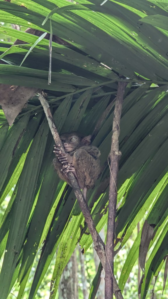 Auf der Halbinsel Bohol sind auch die Tarsier-Äffchen zuhause. Diese härzigen Viecher haben riesige Augen, frosch-artige Fingerlein und sehen einfach zum knuddeln aus. Ob es sich wirklich um eine Auffangstation handelt ist unklar. Jedenfalls wird auch hier ein grosses Geld gemacht und es hat zig Menschen die allen Warnschildern zum Trotz mit dem Blitz die armen Dinger ablichten. Auf dem Weg zurück nach Panglao hätten wir noch fast ein paar Menschen überfahren, die gefährlich hinter einer Kurve mit ihren weissen Influenzer-Kleidchen in Szene werfen. Während rund 5km stehen am Strassenrand immer wieder Roller, Autos und Busse während mitten auf der Strasse ganze Gruppen von Menschen für Fotos posieren. Warnschild Fehlanzeige. In der Unterkunft haben wir dann herausgefunden, dass dies der offenbar bekannte Man Made Forest ist.