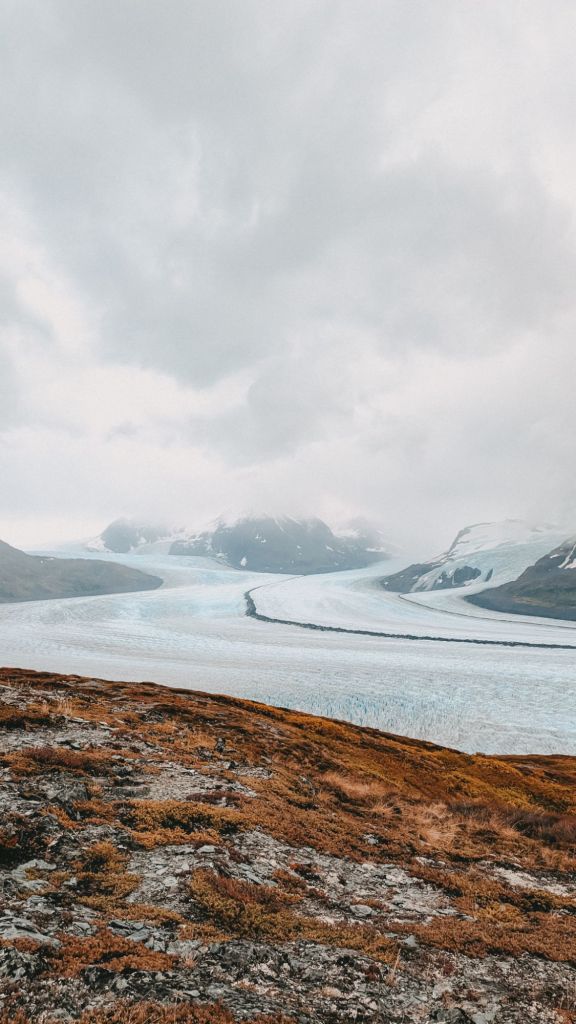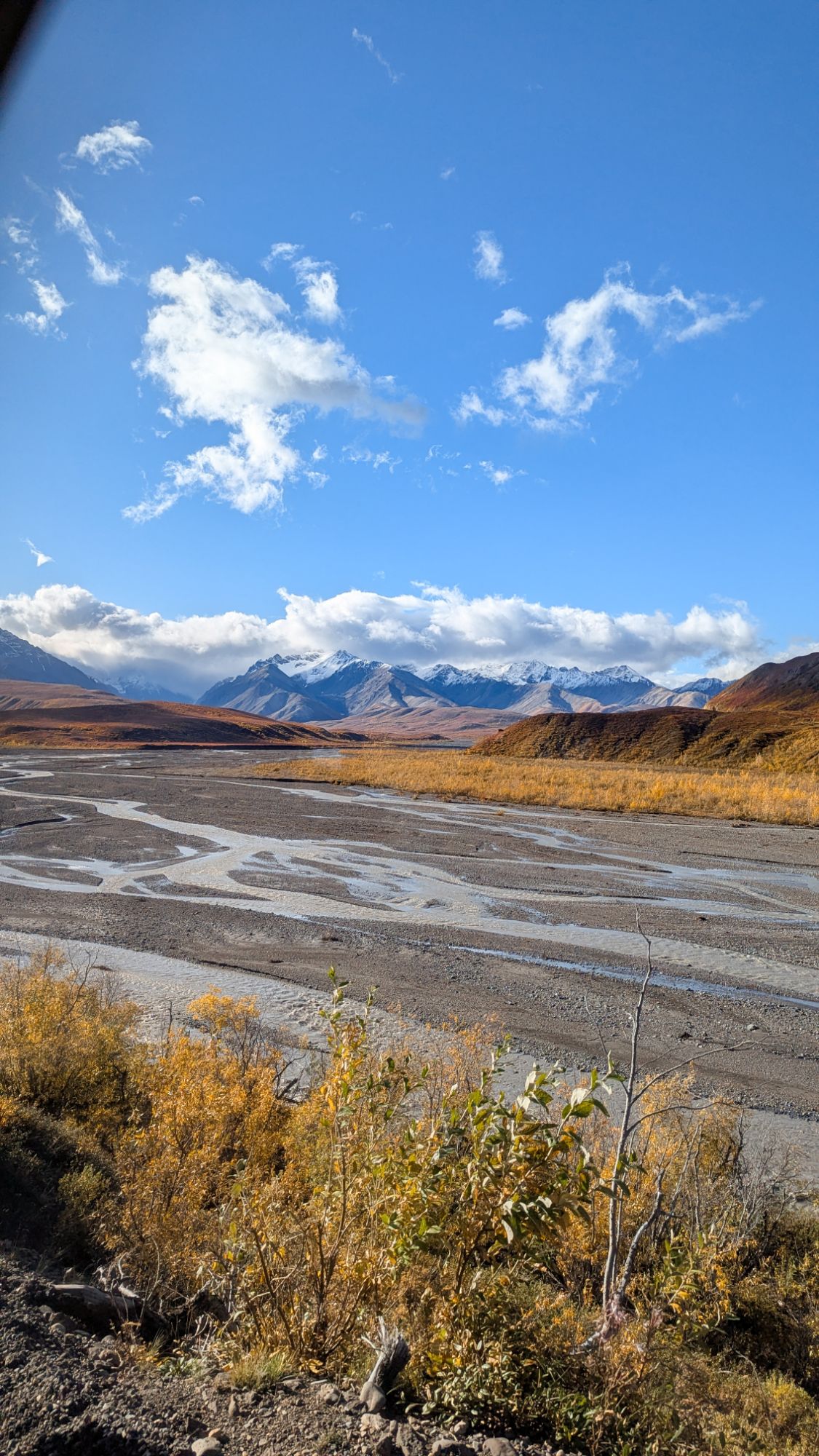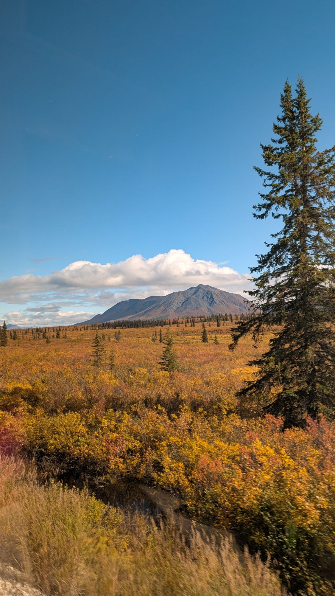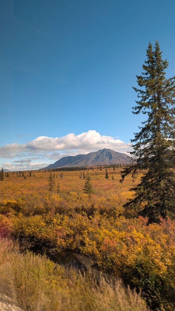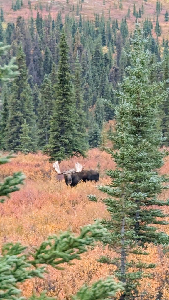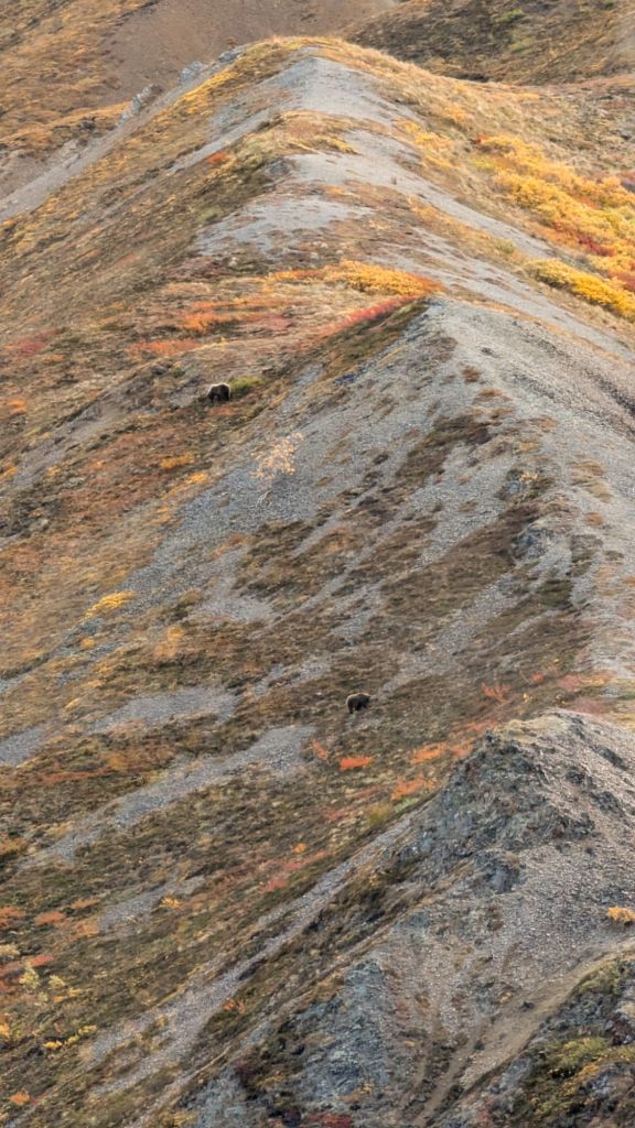 Im gleichnamigen Dörfli, welches aus ungefähr 10 Hotels, einer Tankstelle, einem improvisierten Supermarkt und ein paar Restaurants besteht, übernachten wir. Die Saison hier dauert von Juni bis Mitte September. Zwei Tage nach unserer Reise wird hier alles geschlossen. Während der restlichen 8 Monate im Jahr ist das Dörflein ausgestorben und niemand lebt hier. Der Supermarkt ist entsprechend leer und für Sage und Schreibe 3 USD kaufe ich mir hier einen Apfel weil ich dank der amerikanischen Ernährung so langsam an Skorbut leide. Am nächsten Tag geht es unter stahlbaluem Himmel in den Nationalpark. Der Weg in den Park ist für private Fahrzeuge gesperrt. Nur für zum Camping oder mit einem zertifizierten Guide (in einem alten riesigen Schulbus) ist es möglich, mit dem Fahrzeug in den Park zu fahren. Der Boden ist bereits tiefrot, die verschiedenen Büsche sind voller farbiger Blätter, Bäume gibt es kaum. Nach ca. 10 Minuten sehen wir die ersten Elche. Was für ein Gänsehautmoment. Doch es kommt noch besser. Weit abseits in der Ferne ragt ein riesiger schneebedeckter Gipfel aus der Wildnis. Der Mount Denali (welcher die nicht ganz so weltoffenen Amerikaner Mt. McKinley getauft haben). Mt. Denali ist aber der Name, dem ihm die Eingeborenen gegeben haben und darum nennen wir ihn hier auch so. Unser Guide hat den Berg in dieser Saison erst 4x gesehen und er fährt fast täglich in den Park. Um den höchsten Berg und einen der Seven Summits zu sehen, braucht man also eine ordentliche Prise Glück. Gemäss unseren Recherchen liegen die Chancen bei unter 20%. Irgendwo in der Mitte vom Ende der Welt sehen wir dann auch zwei Bärenmanis, die gemütlich einen Hügel hoch trokeln… Und zum Dessert gibt es noch für alle ein Einzelzimmer in der heimeligsten Lodge.